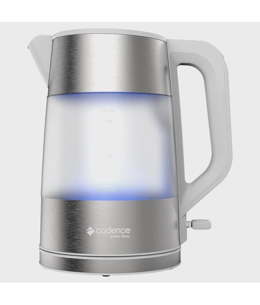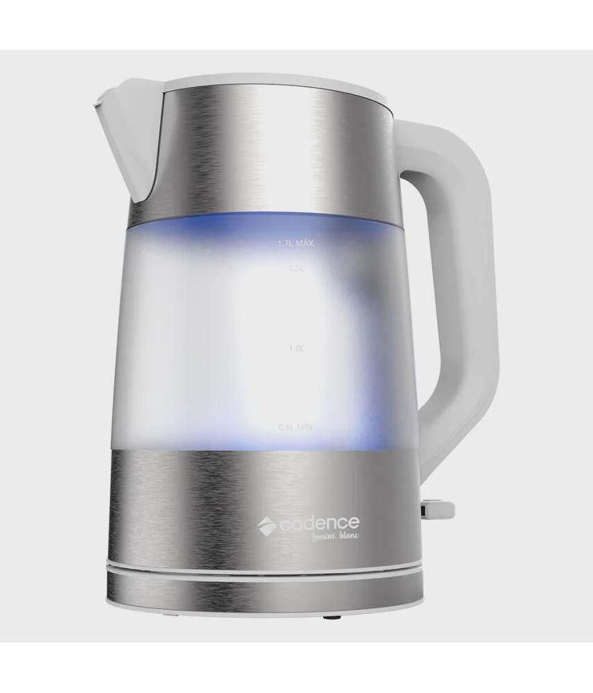 Com grande capacidade de 1,7L, permite que aqueça água para preparar apenas um chá, ou ferva água para adiantar o preparo de sopas e legumes, leds no corpo da chaleira e acabamento em inox: resistente, higiênica e durável.