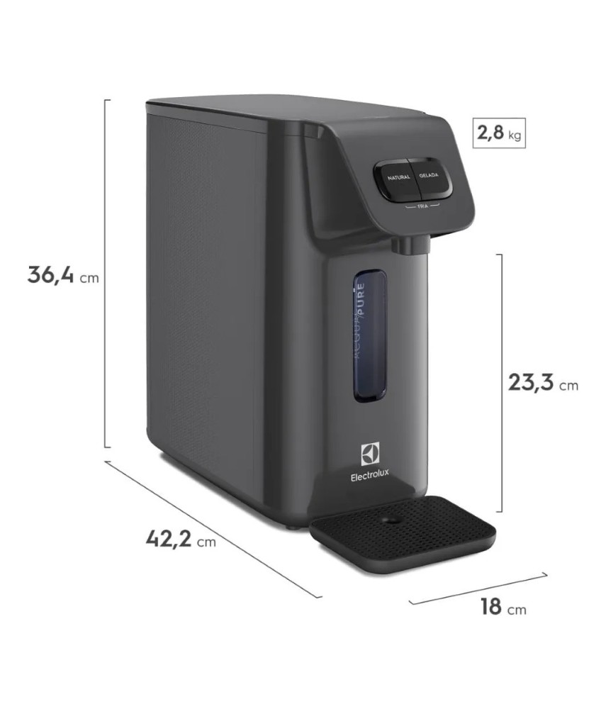 Além disso, o purificador dispensa o uso de pilhas e possui design compacto e versátil, com a altura ideal para diversos recipientes, como copos, panelas e jarras. Ocupa menos espaço e pode ser instalado na parede.